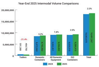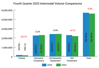 CALVERTON, MD (February 13, 2026) – Total intermodal volume fell 2.0 percent year-over-year in the fourth quarter of 2025, according to the Intermodal Association of North America. While domestic container originations grew 2.2 percent, international containers declined 4.7 percent, and trailers dropped 23.1 percent. For the year, total volume rose 2.3 percent.